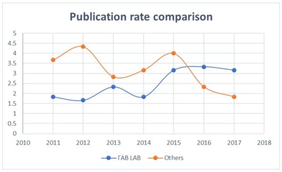 In Figure 6, we see how the average number of publications for lab members raised from less than 2.5 papers per year before 2014 to more than three papers per year after the establishment of the lab. Please note that the lab was founded in August 2014, with its first articles achieving publication in 2015. The raw data that produced this graphic, and the next one, are listed in Appendix A and can also be verified in Google Scholar.