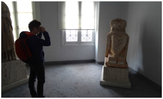 By using the museum as our test bed and also letting students use the museum as the object of their theses, through our cooperation with the Ephorate of Antiquities, we have had a number of side-effects. First of all, researchers and students became familiar with the museum. The public has also become more aware of the museum, as they have been invited on various occasions to participate in experimental sessions. Finally, the museum potential has been augmented too, as the tools and applications that have been produced from our work are now at its disposal. As such, the museum now has an electronic guide that connects to Facebook to gather personalization information and customize the presented content, an augmented reality application that uses the Google cardboard as seen in Figure 8 and new narratives that connect its exhibits to others in museums all over Europe. Should we have developed these tools on our own, without closely consulting with the stakeholders that will use them, they would probably be less suitable for practical application—and also the stakeholders would be less aware of their existence.