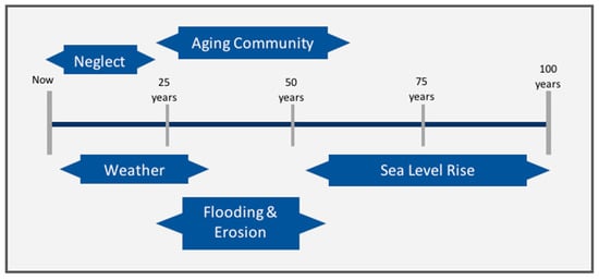 To conceptualize threats to the historic structures within a temporal context, we developed a timeline to illustrate the perceived vulnerabilities (Figure 2). As previously mentioned, deferred maintenance (i.e., “neglect” in the voice of our participants) was the most pressing, current threat. In the next 25–50 years, participants expect that community members with connections to CALO will have all passed away, leaving only children and grandchildren with less direct connections to carry their cultural meanings into the future. Flooding and erosion were also perceived as being unavoidable threats, but participants did not expect to see these impacts for at least 25 years or more. Lastly, participants perceived that the structures would be vulnerable to impacts from sea level rise between 50–100 years from now.
