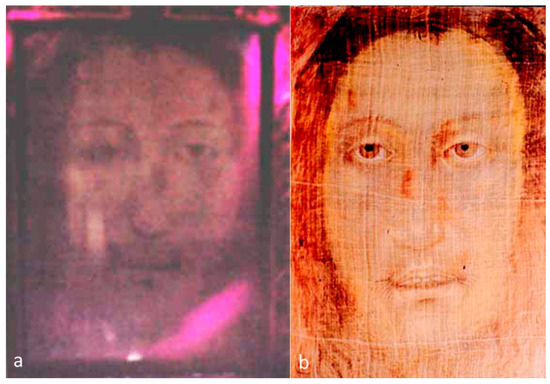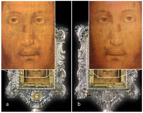 Figure 6a,b), i.e., when the component due to transmission through the linen threads becomes important. The fact that reddish details are less visible with direct lighting implies that they are located at greater depths than other colors and, for this reason, become visible only when the light passes through the threads. This would imply that the reddish details colored the linen threads before the addition of the other colors, when there were still no anatomic details of the face, which were added later. All that is singular because the pictorial praxis, and the same practical possibility of realizing the work on such thin threads, would require representing the whole face first and only then adding other details, such as, for example, the traces of blood linked to the Passion of Christ represented in the image. Also, this unusual optical behavior of the reddish details of the Holy Face of Manoppello should be placed in relation to one of the many traditions linked to the Veil of Veronica, which would associate the image of the Holy Face to a pious woman (“Veronica”) who would have wiped the sweat and the blood from the face of Christ during the ascent to Calvary. But, in addition to blood, the complete image of the face would also appear. What emerges from an accurate analysis of the Holy Face of Manoppello seems to represent this tradition. It remains unexplainable how this particular sequence of coloring the icon, with reddish details placed at a greater depth and impressed before the other colors, could have been obtained on a such a thin starched linen veil. A more accurate Raman characterization than those already done, using modern instrumentation, or an X-ray characterization could provide useful experimental data about the nature and chemical composition of the reddish details, Veil, and other pigments.
