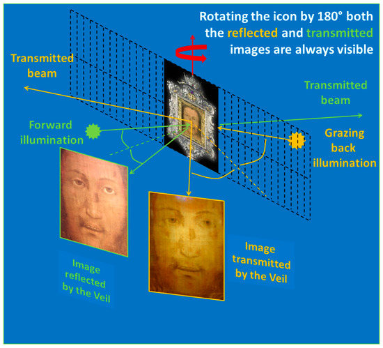 Moreover, the face is visible even if it is observed by back-illuminating it with grazing light and observing the Holy Face transmitted by the Veil, as schematically shown in