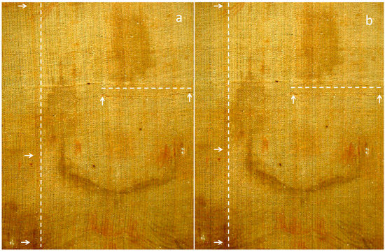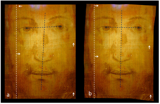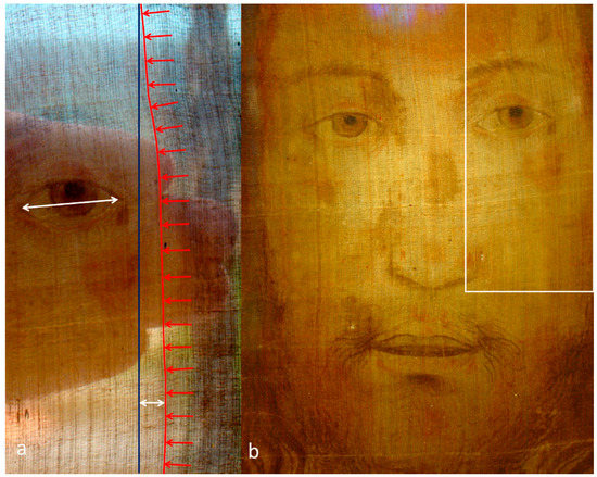 Figure 3a shows that the rotation of the vertical threads is equal to ±7°. The white arrow at the bottom indicates the maximum displacement detected in the weaving of the fabric caused by the deformation. For comparison, another white arrow is drawn inside the right eye, which allows us to assess the extent of the deformation—equal to about a quarter of the width of the eye. Since a human eye, in proportions of 1:1, in correspondence with the anatomical area in which the white arrow lies has an average opening of 2.3–2.4 cm, it follows that the distortion of the weaving causes a displacement of about 0.5–1.0 cm in the horizontal dimensions of the right cheek. This deformation falls just in correspondence with the swollen cheek and can, for this reason, have been unnoticed before. In light of this analysis, part of the swelling of the right cheek is due to the deformation of the fabric structure. Also, other evident asymmetries of the face, like the different distances of the eyes from the nose–mouth axis, could have their origin in the deformation of the Veil. Since B. P. Schlòmer [