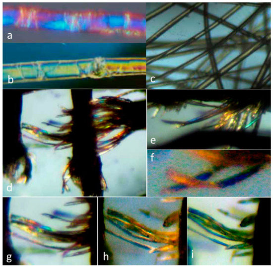 Figure 5h,i, regarding the same region but obtained with a neon lamp. In these last figures the presence of birefringence is also evident. From the analyses carried out in polarized light, we can exclude the possibility that it is sea byssus. It seems confirmed, instead, that the Veil consists of thin linen threads.