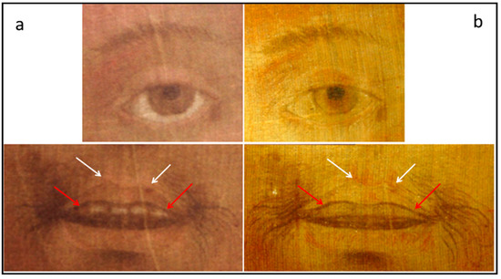 Figure 6a,b are the same. Moreover—and this is the most unusual aspect—not only is the white of the teeth no longer visible, but in grazing light the teeth themselves are no longer visible. It is as if in the image visible in grazing light the upper lip is placed lower and covers the teeth, which are therefore no longer visible. At the same time, however, as evident from the comparison of the red and white arrows shown in