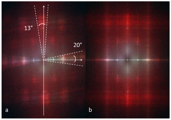 Figure 11a,b, on a logarithmic scale, after subtracting the components with the lowest spatial frequency (typical of the anatomical features) to highlight the higher ones, the latter linked to the smallest details present in the image, such as, for example, the threads of the fabric. The FT of the image in