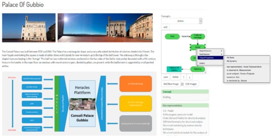 Acierno et al. introduce in [] a CIDOC CRM based ontology, extending it by adding buildings and building elements with the help of a fine-grained model, which introduces horizontal and vertical building components. It also adds investigation processes with the goal of conservation of cultural assets to the domain set. Furthermore, a direct connection between a Building Information Modelling Software and the classes describing buildings was established, which yielded a knowledge enriched 3D model of the researched artefacts. Both building design and knowledge-enriched visualisation are high-grade outcomes and deserve further examination. Acierno published the approach after the development of the HERACLES Ontology.