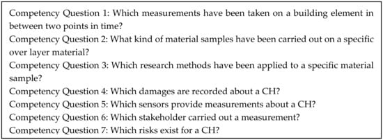 Several methodologies for the design of ontologies have been around for quite a long time, as introduced in []. To develop the HERACLES Ontology, we chose a workshop approach, in which end-users specified their requirements to the ontology, based on the methodology of Grüninger and Fox []. In this methodology, competency questions (CQs) delimit the area of interest and are used to test the capabilities of the ontology. CQs offer an intuitive way to describe the challenges that are part of the daily work of the end-users. We firstly used the CQs to delimit the area of interest; necessary domains had to be identified and sharply confined to avoid overloading [] (p. 309). Secondly, since many ontologies are too general and oversimplified to be useful for practitioners [], we used them to ensure practicability. To ensure practicability, we involved the platform end-users, based on their expertise (monitoring of CH, material analysis and development, meteorology, researchers, conservation, risk assessment, management etc.), in designing the ontology from the very beginning. Through making use of their knowledge, the HERACLE ontology aims to be ready to use for the HERACLES use-cases and, through the end-users expertise, we aim for an outcome applicable for other built cultural heritage facing the challenges of climate change as well.