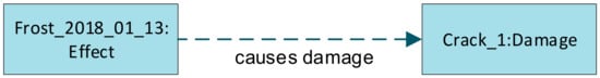 In Figure 4, instances of classes are shown in light-blue edged boxes. A colon separates the content of the box. The first part gives the name of the instance. The latter part gives the name of the class the instance belongs to. Frost_2018_01_13 is an instance of class Effect. The class Effect relates through property causes damage to the class Damage. Frost_2018_01_13 is related through causes damage to instance Crack_1, an element of class Damage. The meaning/semantics behind this triple is intended to indicate, that Frost_2018_01_13 caused Crack_1.