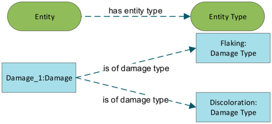 In the ontology, we distinguish between the classes Entity and Entity Type. An Entity Type represents the various types an instance of Entity can be instantiated as. This modelling enables several types of Entity to compound. An instance Damage_1 of class Damage for example can have both Damage Types discoloration and flaking. The actual manifestation of the damage is instance of class Entity. Through this approach, the ontology can categorize instances of Entity with the same type in Entity Type, as shown in Figure 5.