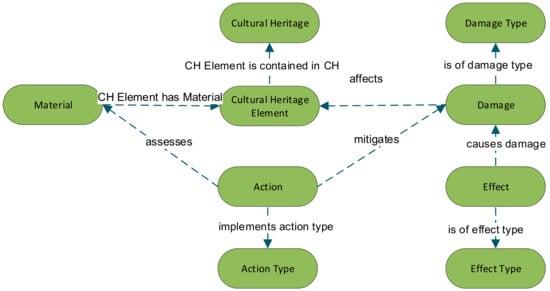 In the context of the MONDIS project, Cacciotti et al. developed the Monument Damage Ontology []. The ontology serves for both conventional documentation of monuments, as well as describing monument damages. The proposed modelling enables the ontology to distinguish between the consequences of an effect (e.g., crack or flaking) and the mechanisms that led to it (e.g., temperature changes or acid rain). The description of damages and their occurrence seems to be well-suited for describing damages on CH. Nevertheless, actions for the mitigation of damages come up short: though the authors try to give suggestions on how to handle damages, these are firstly based on historical data and, secondly, the semantics have to be analysed by the reader: no explicit semantics for conservation methods are introduced in the ontology.