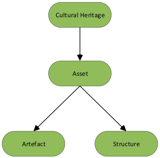 The class Cultural Heritage (Figure 7) allows for representing cultural heritages whose protection or management needs to be described. As stated in the UNESCO Convention concerning the Protection of the World Cultural and Natural Heritage from 1972, world heritage contains both cultural heritage as well as natural heritage []. The HERACLES project, and therefore the ontology, focuses on cultural heritage. The UNESCO separates cultural heritage into both tangible and intangible items. In the respective ontology, we target tangible cultural heritage. The subclass Asset of the parentclass Cultural Heritage represents all tangible cultural heritages. If a use case desires the integration of intangible cultural heritage, a second subclass of Cultural Heritage can be integrated. We chose this approach to hold capacities for an eventual expansion available.