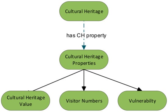 Cultural Heritage has properties contained in Cultural Heritage Properties (Figure 8). To this point, the ontology distinguishes Vulnerability, Cultural Heritage Value and Visitor Numbers. Vulnerability and Cultural Heritage Value are introduced for the determination of Risk, which quantifies possible threats to the cultural heritage. The HERACLES project employs the total economic value analysis for the value assessment of a CH. The economic value is stored as Cultural Heritage Value. This class again contains both Direct Economic Value and Indirect Economic Value. Direct Economic Value describes the economic value created by admission charges or other sources of directly generated profit. The latter describes the economic effect by an enhanced community image, leading to, for example, positive tourism effects and social interaction. A further cultural heritage property is the vulnerability of a cultural heritage to an Effect. The vulnerability to a specific hazard is expressed by the likelihood of an actual damage occurring during the occurrence of an event. This likelihood can be calculated for the whole asset or for discrete sections of the CH. Visitor Numbers is the key performance indicator for the number of persons visiting the asset.