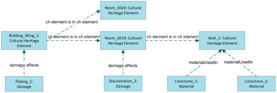 Figure 10 shows three instances of a Cultural Heritage Element. Building_Wing_1 contains Room_S020 and Room_S019, which contains Wall_2. These instances can have measurements or damages attached: In this example, Building_Wing_1 is affected by damage Flaking_1; Room_S019 is affected by Discoloration_2; from Wall_2 samples of material, Limestone_1 and Limestone_2, have been taken.