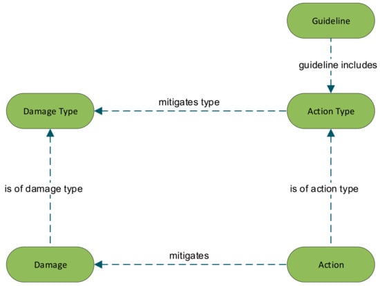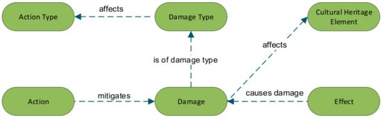 The class Damage (Figure 11) describes actual changes that occurred on an instance of the class Cultural Heritage Element due to an event. In the adjacent class Action, the actions mitigating a specific damage are represented. The class Damage Type contains several descriptions of damages that can occur to a cultural heritage. By this modeling, we enable the ontology to categorize damages into several types and choose from Action Type, for which mitigation action might be appropriate.