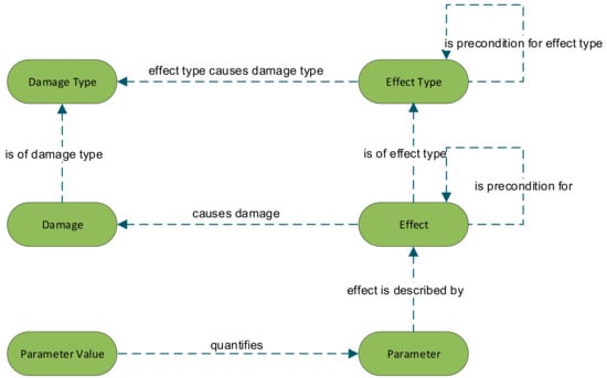 Effect (Figure 12) contains all occurrences of abiotic factor induced climate events. This can be a real instance of a flood that occurred at some point in time or a real storm that hit the coast. Effect Type implements a differentiation between all effects. Instances in Effect Type are predefined and contain elements, such as Heat Wave, Flooding, High Sea Level, Land Slide and Waves. An instance of Effect Type can cause different instances of Damage Type, which enables us to predict or suggest possible damages caused by an incoming Effect. An actual occurrence of Effect can, but does not have to, cause an actual occurrence of Damage. An Effect is further described by a Parameter, a measurement of the surrounding physical phenomena.