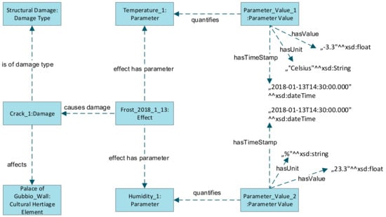 Figure 13 shows an example for damage on a Cultural Heritage Element, namely Palace of Gubbio_Wall. A damage Crack_1 has been observed. Crack_1 is of damage type Structural Damage. It occurred due to the effect Frost_2018_1_13. Frost_2018_1_13 has the parameter Temperature_1. Temperature_1 has attached Parameter_Value_1, with “−3.3”^^xsd:float, “°Celsius”^^xsd:String, “2018-01-13T14:30:00.000”^^xsd:dateTime, which refers to a temperature of −3.3 °C, recorded on 13 January 2018. The effect Frost_2018_1_13 has another parameter Humidity_1, with Parameter_Value_2, which has the values “23.3”^^xsd:float, “%”^^xsd:string, “2018-01-13T14:30:00.000”^^xsd:dateTime”, indicating the recording of the relative humidity of 23.3% on 13 January 2018.