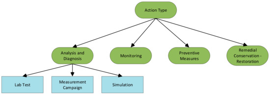 An Action taken can be categorized as Analysis and Diagnosis, Preventive Conservation, Remedial conservation and Restoration conservation, subclasses of Action Type. An action in Analysis and Diagnosis can be a Lab Test, Measurement Campaign or Simulation, to name a few examples for one of the classes. By mapping potentially good conservation practices and types of damages, we enable our ontology to give suggestions on how to handles specific damage types. See Figure 15 for a conceptualization.