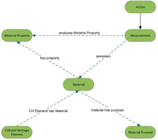 Zhang et al. introduce an ontology based knowledge framework for engineering materials and the selection of materials for specific purposes []. The focus lies within choosing materials for manufacturing processes and omits sensitivities and compatibilities of material combinations. Since the compatibility of conservation materials used in cultural heritage preservation is an important aspect, Zhang’s ontology does not meet our requirements [].