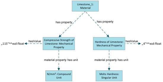 An analysed material can have several properties, such as mechanical or chemical properties. The example in Figure 18 depicts a material Limestone_1, which has two properties: Compressive Strength of Limestone and Hardness of Limestone. Both instances have the datatype property hasValue attached. The graphic indicates the analysed material has a compressive strength of 115 N/mm² and a hardness of 4 on the Mohs scale.