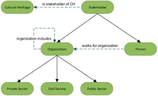 The domain Stakeholder represents all relevant stakeholders in the HERACLES project (Figure 19). Stakeholders can be single persons, represented by the class Person, or part of an Organization, that take action of responsibility for a Cultural Heritage. An Organization can employ entities from the class Person. An Organization can contain other Organizations, for instance a union or association. In Organizations, the ontology distinguishes between entities from Private Sector (e.g., conservation contractor), Civil Society (e.g., NGO for Cultural Heritage), and Public Sector (e.g., Ministry of Culture).