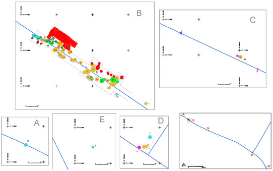 Location of the structures on the top of the hill (B and C) and on the upper slopes of the hill (A, E and D).