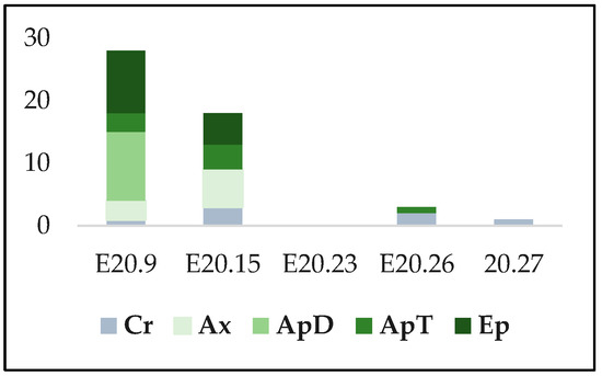 Anatomical representation, in each pit (Cr—cranial elements; Ax- axial elements; ApD—front limb elements; ApT—hind limb elements; Ep—other limb elements).