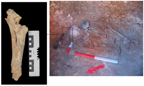 In the funerary chamber of hypogeum H9.4 a Bos taurus fused left radius and ulna (Table 4) were associated to a female adult skeleton of advanced age. The human skeleton was placed in left lateral decubitus. The faunal offer was placed near the human cranium, alongside a copper dagger and near the hands of a ceramic pot (Figure 7).