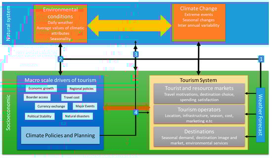 Climate change impact pathways (1: Weather to environmental conditions; 2: Macroscale drivers of Tourism to environmental conditions; 3 Socioeconomics to Natural System and 4: Climate Policies on Natural system) on international tourism (modified from the literature []).