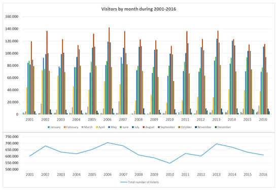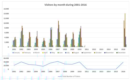 Regarding Rocca al Mare, the number of visitors by month during 2001–2016 is given in Figure 5. It should be noted that the fortress of Rocca al Mare was closed from April 2011 to 17 August 2016 for conservation and renovation.