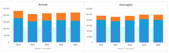 The estimation of the total economic value of Gubbio is based on the forecast regarding the expected number of visitors in Gubbio. This forecast is based on the arrivals, overnights and average length of stay in Gubbio during 2012–2016 (Table 3 and Figure 6). This data set is available from the Region of Umbria—Directorate for Tourism.