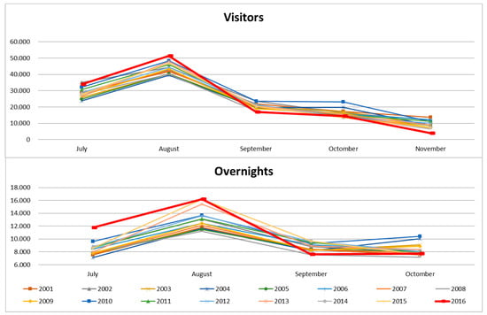 Number of visitors and overnights in Gubbio from July to October (2001–2016).