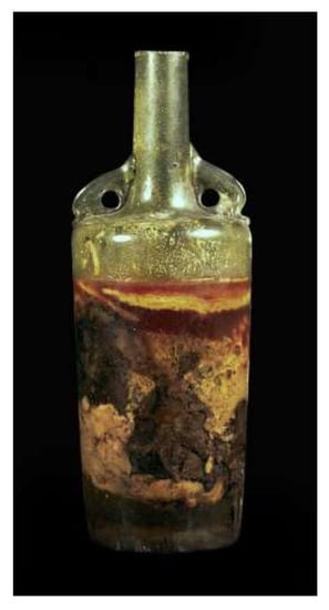 It is common knowledge that food products deposited in prehistoric times are not preserved in their original, nor even similar form. Archeologists and researchers of related sciences (such as archaeobotany, palynology or archaeozoology) derive information about the diet from found plant (pollen, grains, fruit stones) and animal remains (bones above all) as well as from bone isotope studies. Food residues accumulate also in the form of lipids and deposits on the inner walls of the vessels in which they were prepared or stored [5]. The same problem occurs when it comes to wine. Currently, the earliest trace of wine production is considered to have been found on a ceramic vessel, on which the residues of tartaric acid were identified. The vessel, dated to the end of the 6th millennium BC, was discovered in the Iranian site Hajji Firuz Tepe, north of the Zagros Mountains. It is possible that the ceramic container was filled with wine made from wild grapes [6]. Only one (and the oldest in Europe) finding of wine in liquid form (Figure 1) comes from the area of our interest, which is European Barbaricum in the first centuries of the current era. It was found in Speyer, a town located on the Rhine in the state Rhineland-Palatinate in Germany. This wine, dating back to 325 AD, is preserved in a greenish-yellow, cylindrically shaped glass bottle with two dolphin-shaped handles and was retrieved from a tomb of a man and a woman of Roman origin [7].