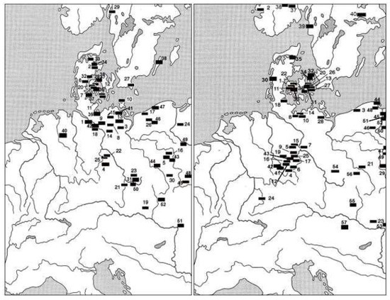 Maps showing range of occurrence of vessels for preparing and drinking wine on the example of princely graves. The first map shows burials from Lubieszewo phase (periods B1–B2 of Roman period), and the second—burials from Haßleben–Leuna–Zakrzów phase (periods B2/C1–C2). Source: M. Gebühr 1998, pp. 186–187 with additions made by A. Migała [15].