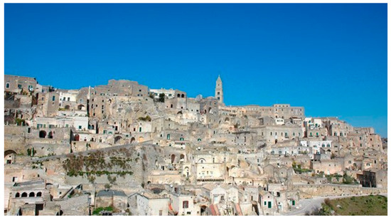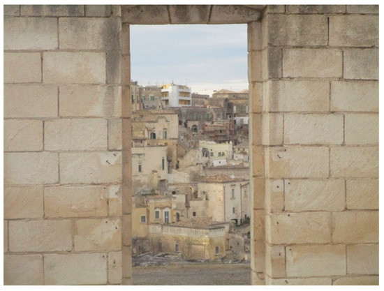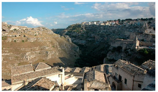 - D’Alessio, L.; Lucente, S. Matera: A wonderfully chaotic city. In Proceedings of the VIth Conference Diagnosis, Conservation and Valorization of Cultural Heritage, Napoli, Italy, 10–11 December 2015; Aracne Editrice: Napoli, Italy, 2015; pp. 185–191. [Google Scholar]