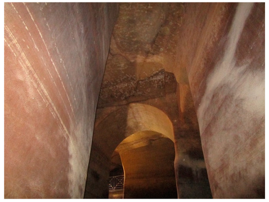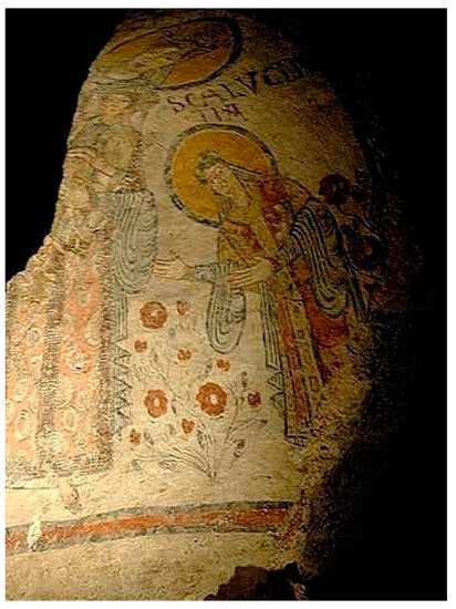 There is still a lot to do, going from the global to local vision and vice versa. For example, in Matera we move towards the rock churches, (see Figure 12). A deep study of the cave type and morphology by means of fractal dimensions was carried out in Reference [14]. In general, the computation of the fractal dimension is related to the empty/full ratio. It allows us to describe and study the evolving natural phenomena. We can describe the shape of the cavities in a geometrical way; the natural ceilings like the floors are full of rock roots. In turn, we can use the powerful fractal technique to calculate the ruinous work of time on frescos. If a mildew appears some cave-crypt, we can take a photo of its expansion and compute the fractal dimension; repeating the data survey, we can see that if the fractal dimension is increasing, then the mold is expanding. In conclusion, we can plan the schedule of interventions. Telling this to the tourists, we are sure they will appreciate the usefulness of the fractional dimension.
