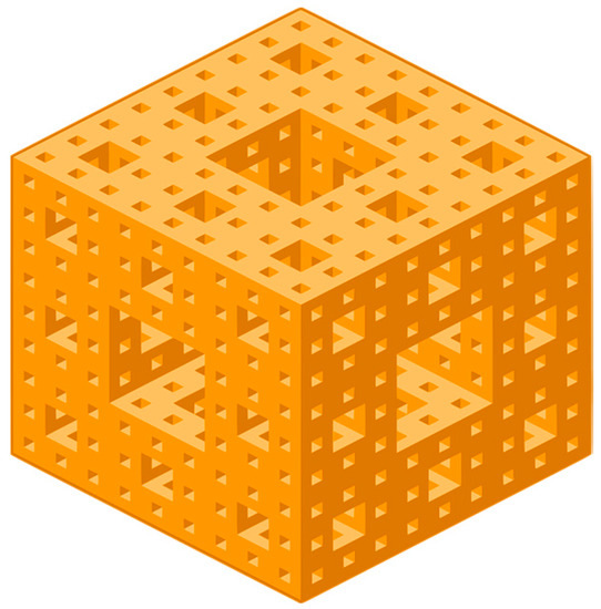 Here, we want to suggest to a tourist guide how to explain this comparison between Matera and a mathematical sponge in a better way. To do this, we draw attention to the continuous succession of edges. The number and disposition of edges determine whether a polyhedron is a cube or a prism. Looking at its edges, we claim that Matera has the shape of a children’s book! First of all, it must be clear that what we mean by “book form” is overlapping sheets of the same size to create a volume. This definition only applies to cities or skyscrapers. The request that the sheets be of equal size in a volume is not necessary. When the sheets were made from dried plants, the shape of the sheet varied according to the humidity of the air. Even an ancient book in which the pages are cut to separate them has different-shaped pages. Finally, some books for children that fill our bookcases today have recesses and holes and images printed on the edge that make each page a different shape from the previous one. Matera is a book of the latter kind. Its stone pages all have different shapes and this influences the volume of its houses, the number and the position of its edges, and therefore, its story. The word “volume” is used in publishing and in geometry: These multiple meanings hide a secret. In the history of mathematics, it took thousands of years to formalize the process that leads from the superimposition of very thin (two-dimensional) sheets to the concept of volume (three-dimensional). Likewise, if we write on a single page with lowercase, infinite lines (one-dimensional), we would fill the whole sheet. Mathematicians also know a special book in which the sheets are pierced so differently that the overlapping pages give zero volume. It is like leafing through those books in which you can see images moving very quickly. The images are replaced by appropriately distributed voids and the result is the so-called Menger Sponge (see Reference [12] and Figure 11). It can be seen as a book of blank pages with its infinite margins all annotated. It is an object of infinite perimeter and null volume. Among other things, for mathematicians this is the universal model of a one-dimensional whole (see Reference [13] Section 4.4). It is a kind of continuous story to which all stories can be matched. This is a limiting process, we will never see it complete. Like the model of Matera, which can be seen at Palazzo Lanfranchi, it is nothing but an approximation of the city, so we can imagine figures closer and closer to that of the sponge.