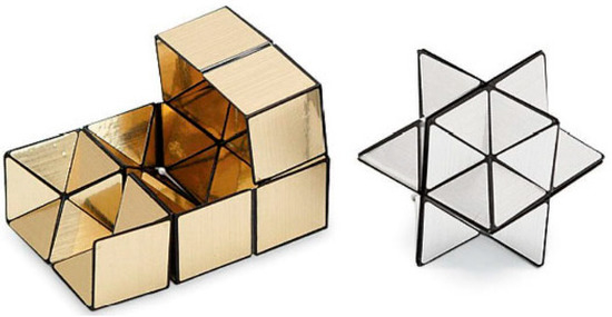 We must not worry about tourists getting scared. We can make this mathematical description together with a graphic representation by means of combinatoric puzzles on which we can paste images of Matera. After the tour for summarizing the itinerary, the guide can again pose the question: how can you divide a cube into two equal parts, but now without using a plane? The cube of Yoshimoto n. 1 was made in 1971, demonstrating that a cube decomposes into two starred rhombic dodecahedra. This puzzle is itself something surprising, so much so as to be exhibited at the Museum of Modern Art in New York in a gold and silver version (see Figure 13).
