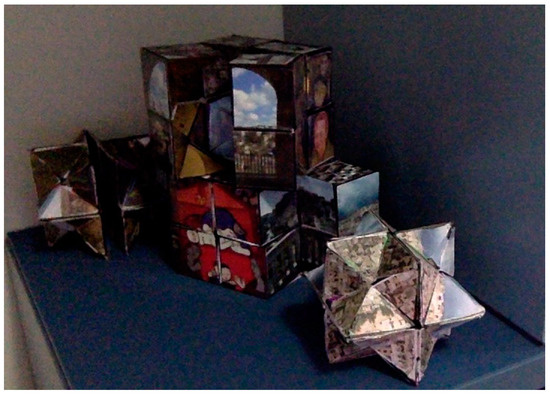 During the Living Lab of the YOCOCU 2018 Congress, the author presented this object covered with images of the Sassi zone (see Figure 14). The two aspects that come together are the shape of the city dictated by nature and man’s chosen urban planning. Mathematical study and knowledge of the cultural heritage contained in Matera were necessary to understand which images to put in the various recesses of the cube (for further details see Reference [15]). At the same moment, each movement of the cube corresponds to a part of the itinerary purpose in this paper.