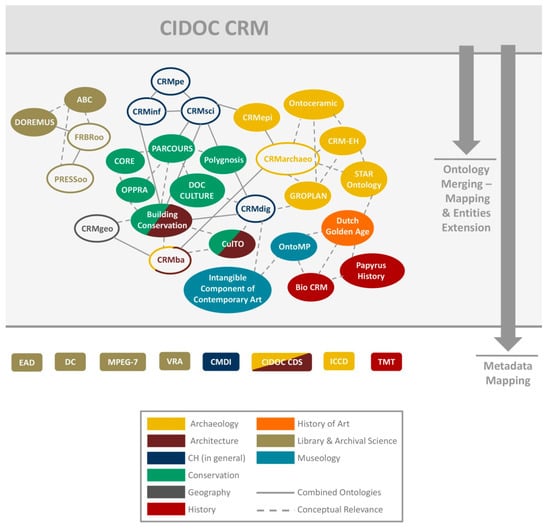 These approaches illustrate the capabilities and implementation range of the CIDOC CRM in the various CH sub-domains and activities, and address some of the aforementioned sciences, tasks, documentation media, and organizational requirements (e.g., in terms of time and space). Moreover, most of the aforementioned projects, as well as additional research projects and relevant publications, propose different cases of the CIDOC CRM mapping/merging with metadata schemas or ontologies, as well as its extension for accommodating specific informational needs (see Table 1 and Section 3). These works have been categorized, and a conceptual correlation between them, which is considered valuable for future work on knowledge representation and management of the domain, is proposed.