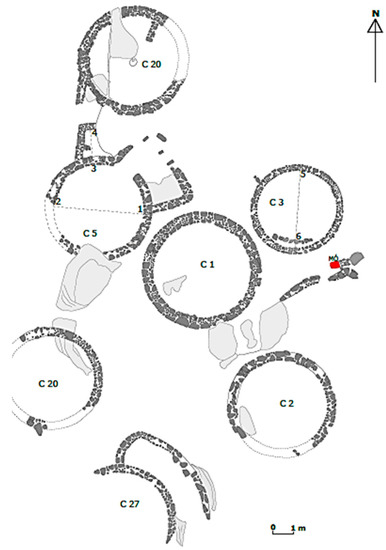 Regarding the internal organization of this sector, the diversity of structures in a limited space—circular houses of varying dimensions, some with atriums and only one with opening at ground level—leads us to assume that this might have been a neighbourhood inside a walled enclosure, similar to other occurrences with other settlements of the recent Iron Age and Romanization of the Northeast, such as Citânia de Sanfins [9].