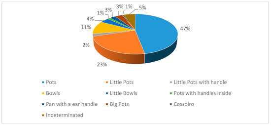 It was possible to identify 144 shapes out of the 152 lips studied. Among them, 56 pots were counted and were used for different types of food storage and transportation, with diameters bigger than 25 cm; 48 little pots (potinhos/púcaros), among them two little pots with a handle (púcaros) (small containers used to serve and consume food and beverages, as well as for cooking); 16 bowls (malgas) and 11 little bowls (tigelas) (to prepare, cook and serve food); two pots with handles inside (panelas de asa interior) to cook food; six pans with an ear handle (panelas de asa em orelha) (presumably to cook food); and five big pots (talhas), which were thought to have been used to store food, given its diameter and characteristics (Figure 10).All the pottery shapes in addition to the English translation, also the original name was placed in Portuguese, in brackets.