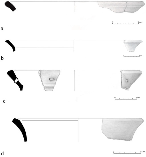 Among the pots, the following shapes were distinguished: shape 1a (pot), shape 1b (pot with edge on uplifted flap) and shape 1c (pot with horizontal edge and flap) (Figure 11).