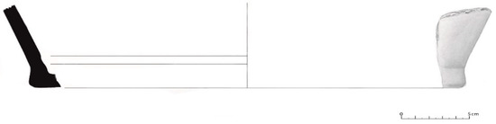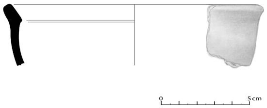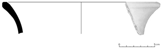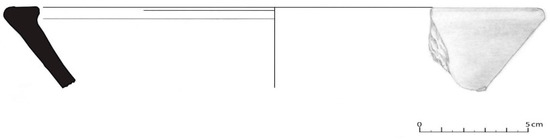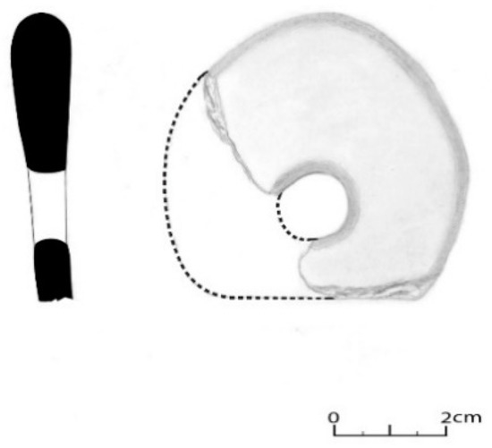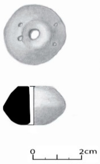 The handles correspond to only nine fragments, with four of a circular section and one of a subcircular section, i.e., they belong to pots with handles inside, two with horizontal gripping, belonging to a pan with a ear handle (Figure 24); one pentagonal and one rectangular or ribbon wing, most likely belonging to the little pots with handles. In House 2, a cossoiro of a biconical type with equal-sized cones was also found, according to Silva e Oliveira [8], and with central perforation (Figure 25).