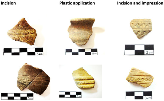 The most common motifs are horizontal or oblique, incised grooves (sometimes carried out with dull edge objects); plastic strands and one or more series of engraved SSS (Figure 28).