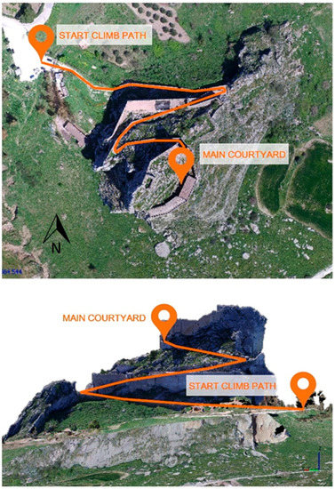 On the south side, the rock emerges the surrounding landscape, and nobody could climb from that side. The only climbing path available exists on the north side, where the system of walls guarantees a less impervious trek from the main entrance to the top of the rock (Figure 2). The central courtyard and the main buildings of the castle are settled on the top of the rock.