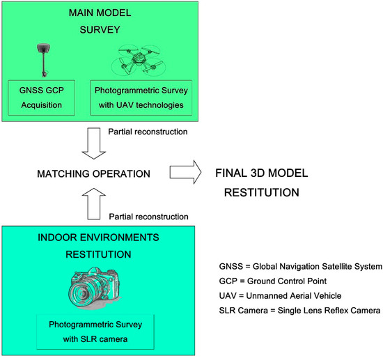 Once we had executed the GNSS and photogrammetric survey, the SFM (Structure from Motion) algorithm was used for the construction of the point clouds of the indoor and outdoor environments. This technology allows the reconstruction of the point cloud using a dataset of photos that captures the surfaces from different points of view [8]. Indeed, with the recent achievements in computer and information technologies, traditional procedures for survey operations have been increasingly replaced with digital close-range photogrammetry [9]. In particular, the reconstruction of the point cloud is obtained using an algorithm that defines a probability distribution of the structure using step-by-step iteration [10].
