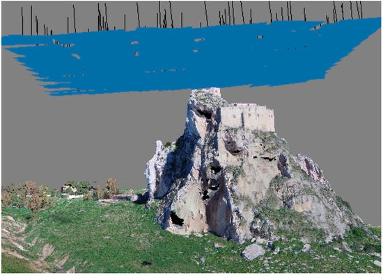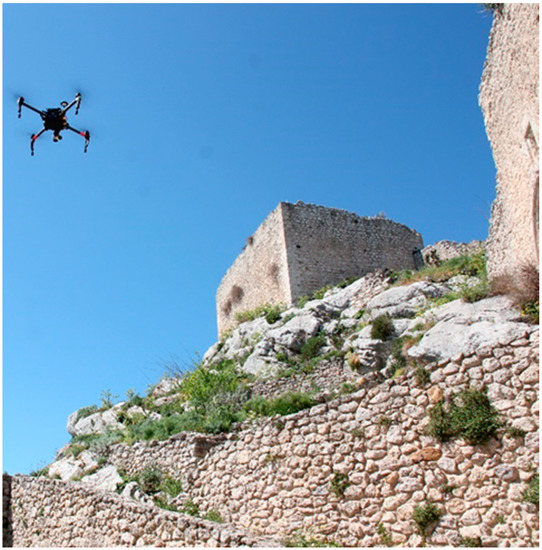 The use of aerial acquisition allows us to achieve the restitution of an impervious and complex environment that would be unavailable using standard topographical equipment on the ground [6]. The study case in this work—the survey and the restitution of the Manfredonic Castle of Mussomeli—led us to choose this technology in light of the limits related to the short time available for survey operations, the complex orographic shape of the site, and adverse natural conditions. These difficulties contributed added value to the goal of this work (that is, the valorization of the Castle of Mussomeli and the surrounding environment), making the reconstruction of the monument and the natural surrounding context an interesting challenge to overcome.