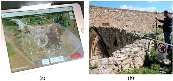 (a) The flight plan monitored on a tablet; (b) GNSS survey operations.