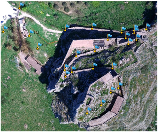 At the same time, a GNSS Real-Time Kinematic (RTK) survey of 24 targets was performed considering visible and recognizable natural points, taken along the only accessible climbing path of the castle (Figure 5a,b and Figure 6). During this operation, the level of accuracy of the GNSS signal was threatened by the natural conditions of the site. Indeed, positioning the GNSS station close to the walls of the castle, we noticed a reduction in signal precision caused by the multipath phenomenon. Furthermore, the presence of the massive rock that hid a relevant portion of the sky dome reduced the number of visible satellites and, hence, the accuracy of the GNSS signal.