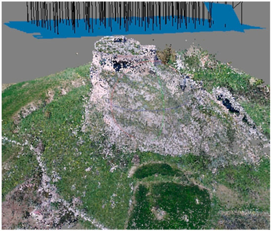 Agisoft Photoscan® software was used for the creation of the point clouds (Figure 7) and the restitution of the 3D models. During the processing of the outdoor environment, the flight datasets of both a 45-degree-inclined camera and a nadiral position camera were used. After a pre-alignment operation choosing parameters for a high level of accuracy, markers with the coordinates of 24 GNSS targets were loaded into the project in order to match every visible marker on every image. The flight plan was programmed considering a 70 m flight height over the take-off surface, obtaining a GSD (ground sampling distance) of 2.91 cm/px, according to the features of the camera. This GSD value is relative to the level of the central courtyard of the castle (the higher zone of the site). Instead, considering the entrance square, positioned at the base of the climbing path (with a 120 m flight height) the GSD achieved a value of about 5 cm/px (Figure 8).